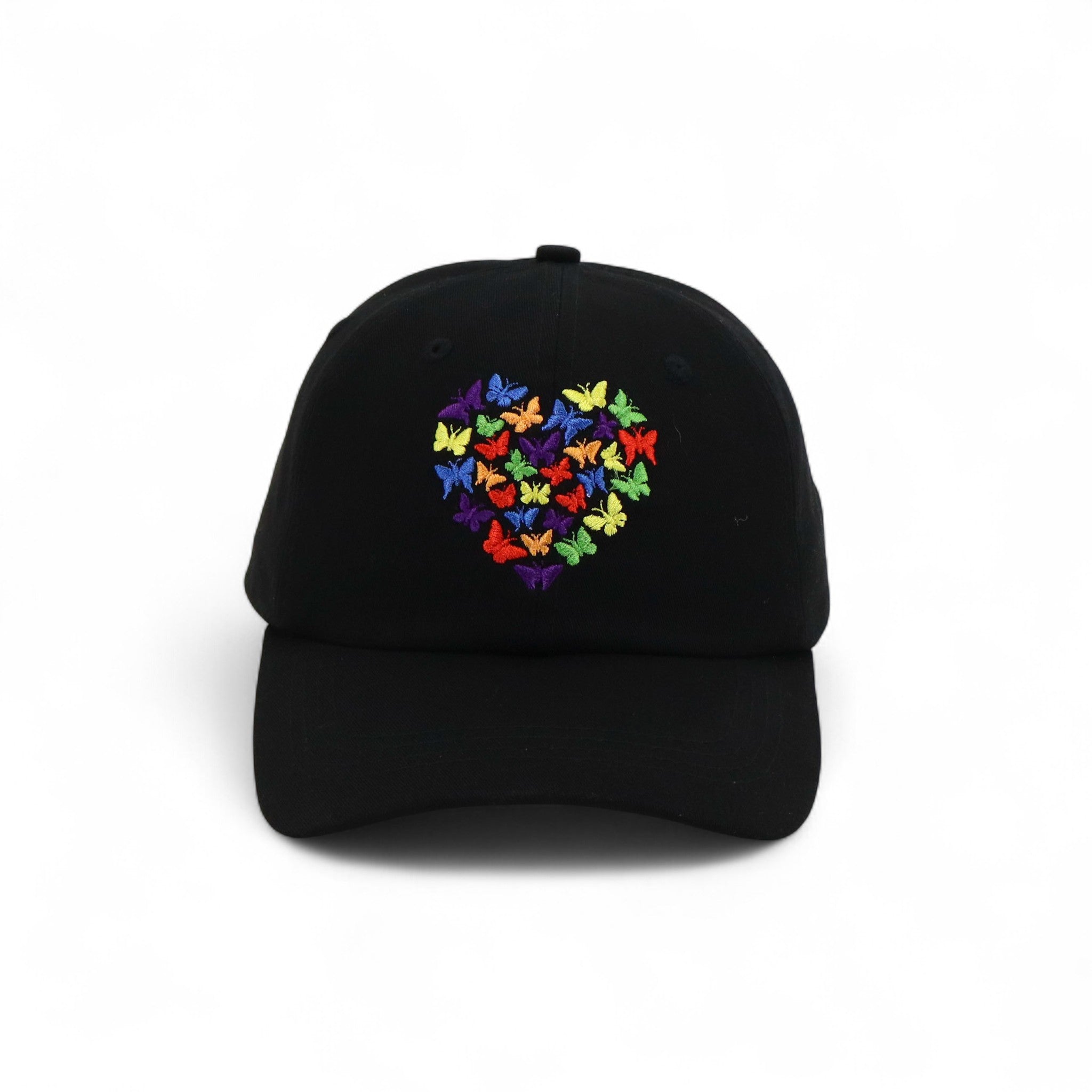 That small flutter when you see someone you like. Gentle, unexpected, real. The Flutter Heart Hat turns that feeling into something you can wear, featuring a heart of embroidered butterflies in the hues of the classic Pride Flag. Subtle, warm, and full of life.